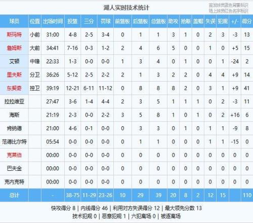 湖人:东契奇41分8板8助2断、詹姆斯15分6板5助、里夫斯14分3板2助2断、斯玛特13分1板3助、拉拉维亚11分5板1助、肯纳德8分3板、海斯6分8板1助、艾顿2分4板
