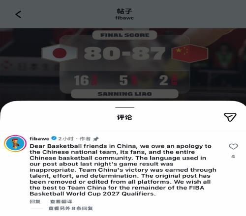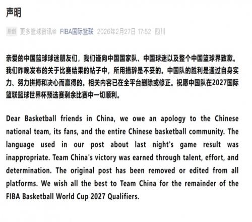 体育播报02月27日宣 FIBA国际篮联官方今日声明,因昨日中国男篮战胜日本男篮的比赛结果帖子中的措辞不当,而向中国男篮、中国球迷以及整个中国篮球界致歉,并同步在国内外平台上。