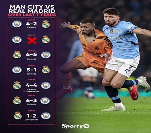 2023-24赛季,两队则在八强战里交锋,皇马首回合主场3比3战平。次回合两队再度战平,皇马最终依靠点球决战淘汰曼城。在2024-25赛季,两队则在淘汰赛附加赛里交锋,皇马主客双杀曼城之后晋级16强。