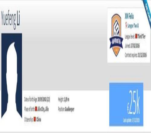 李岳峰现年23岁,司职门将,在2022赛季加盟天津津门虎,目前共为球队出场2次,均完成零封。现在他在德转上的身价为2.5万欧。