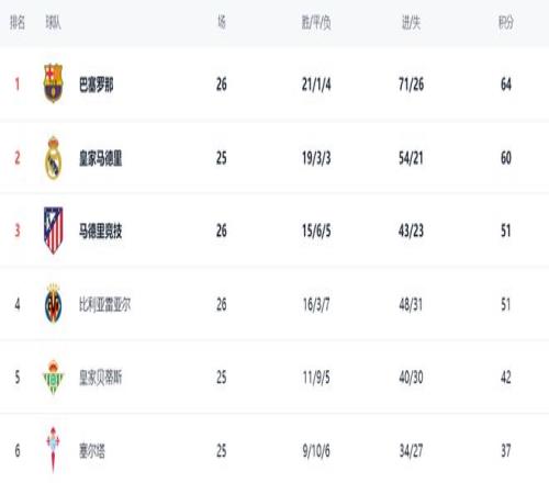 在积分榜上,巴萨占据榜首位置。巴萨的战绩是21胜1平4负,拿到64分。而皇马紧随其后,拿到60分。巴萨比皇马多了4分,但是,巴萨多赛一场。显然,巴萨占据夺冠主动权。马竞赢球之后,总积分达到51分,排名升到第3。而比利亚雷亚尔也是51分,排名第4。皇家贝蒂斯只拿到42分,排名第5,想要进一步提升排名难度极大。