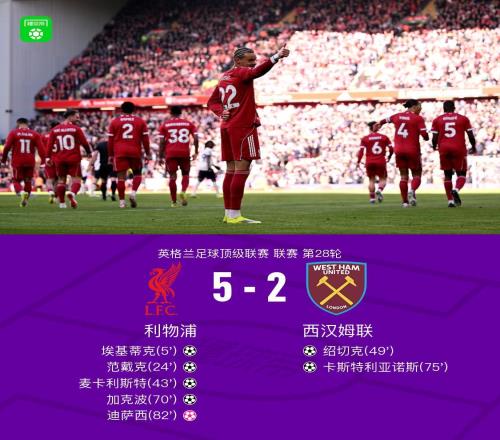 剑南春利物浦52西汉姆联,埃基蒂克两传一射,加克波建功