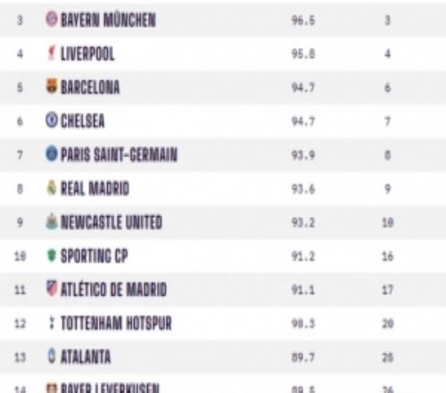 OPTA欧冠16强实力排名:阿森纳居首,曼城、拜仁、红军、巴萨前五